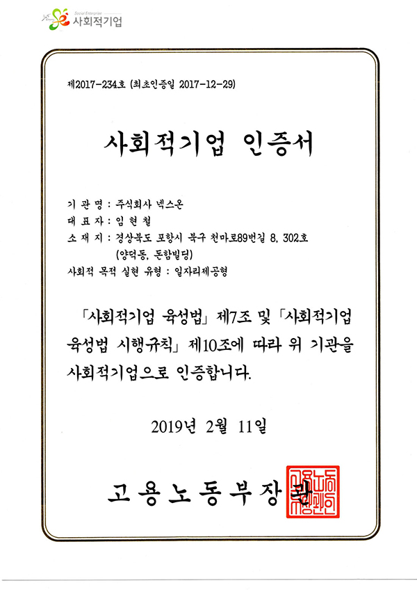 사회적기업 인증서